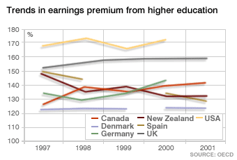 The OECD says having more graduates does not "dilute" the premium on individual earnings of having a degree [no degree = 100] - though some buck the trend.