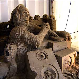 Not from Ancient Egypt - a mummified DJ with headphones, microphone, decks and speakers