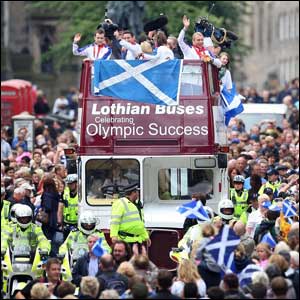 Thousands of people took to the streets of Edinburgh to cheer on Scots Olympic medallists Chris Hoy, cycling team-mate Ross Edgar, rower Katherine Grainger, and canoeist David Florence.