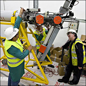 A French-made manipulator arm which can be operated by a worker shielded behind a thick wall.