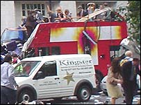The roof of the number 30 bus, which was ripped off in the blast at Tavistock Square, has been removed from the scene for forensic examination.