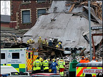 Mr Stewart said a catalogue of errors over more than 30 years had led to the tragedy. The firm which laid the pipeline in 1969 had no previous experience of laying buried pipelines on land and no record of their specifications existed. Mr Stewart told the court that the fittings were not wrapped or corrosion protected, contrary to then and now industry guidelines. In 1972, because of flooding problems, the pipeline's level was raised and the last section concreted over. Again there was no corrosion protection. In 1980 a steel floor was installed over the basement area, sealing it off where the LPG pipeline entered the building. Mr Stewart said: "All risk assessments were done without the assistance of competent outside persons. "The Crown view is that ICL Tech Ltd and ICL Plastic Ltd were simply not entitled to assume that the underground pipework had been installed to an acceptable standard of corrosion protection. "Inspection from within the basement at any time would have revealed an absence of wrapping on the pipework which entered through the bricked-up window."  | Rescue workers searched for 72 hours for survivors