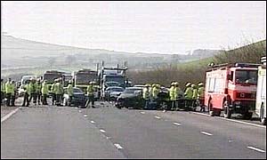 Retired traffic policeman, John Collis, was among hundreds of people who dialled 999 as the pensioner sped off on his final journey. "I saw a Nissan Micra exiting the services the wrong way. My first thought was that it would try to do a sharp left turn but as it happened the Micra just carried on. "I could see an elderly gentleman driving and he looked pale and ashened. "He seemed calm and totally oblivious to the error he had made." Detective Chief Inspector Norman McKeaveney of Wiltshire Police was travelling on the westbound M4. 'Surreal' "I could see a small blue car in the outside lane, on the other side of the barrier - but travelling in the same direction as me. "It must have been doing 70 miles per hour. It seemed surreal. It took me a few moments to realise what was really happening. "I saw six or more vehicles swerve violently to try to avoid this car. "I saw a male driver with his head and arms out of the window trying to draw the attention of the driver. He was also trying to warn traffic to move across." Moment later there an explosion and a ball of flames as Mr Riddle's car ploughed head-on into the Vauxhall Calibra being driven by Mr Selwyn. Depressed Mr Riddle's niece, Linda Harris, told coroner David Masters her uncle told her he was planning to drive to Marlborough area where he had been a stable lad and jockey many years before. She also said he had been depressed by the death of his wife the previous year. Mr Selwyn, from Aberdare, was an aeronautical and mechanical engineering student at Bristol University. Both men died from multiple injuries. A police investigation found signage at the services was inadequate, despite no-entry signs being posted where Mr Riddle had driven onto the motorway. Since the crash, new signs have been put up and a review of all UK service stations is in progress. Mr Masters said he had considered a verdict of unlawful killing on Mr Selwyn, but he could not be certain how the pensioner was in those last miles along the M4 He recorded an open verdict on Mr Selwyn and a verdict of misadventure on Mr Riddle. |