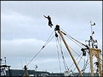 Two youngsters were seen to jump from the ship, but got away before the authorities arrived.