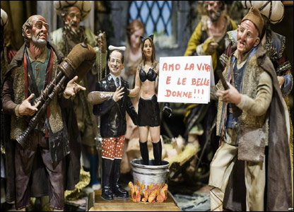 Kryeministri italian Silvio Berlusconi u përball me një krizë politike, të shkaktuar pjesërisht nga ajo që përshkruhet si simpatia e tij për aktivitete argëtuese dhe gra të reja. Kjo skenë që në mënyrë humoristike simbolizon Lindjen e Krishtit e tregon atë me një nga gratë që ka ngritur pretendime kundër tij.