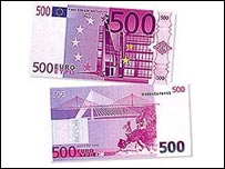 Përmasat: 160 x 82mm Ngjyra: e purpurt Kartmonedha me vlerë 500 euro (rreth 470 dollarë) është kartmonedha me vlerën më të madhe nga të gjitha - dhe jo të gjithë janë të kënaqur me këtë. Kartmonedhat me vlerë të madhe mund të lëvizen lehtësisht dhe euro mund të bëhet monedha e preferueshme për ata që i bëjnë bisht pagimit të taksava dhe që duan të pastrojnë para. Me një milion dollarë nuk mund të blesh aq drogë sa blije më parë, por me kartmonedhat 100-dollarëshe mund të mbushësh një valixhe të madhe. Po ta shkëmbesh këtë sasi me kartmonedha 500-euroshe, ajo sasi parash mund të futet në një çantë të madhe. Megjithatë, në disa vende të eurozonës, si Austria, Belgjika dhe Hollanda, konsumatorët janë mësuar me monedha me vlera të mëdha. Për shembull, vlerësohet se kartmonedhat 1000-markëshe të Gjermanisë përbëjnë deri një të tretën e parave në qarkullim në këtë vend. Banka Qëndrore Evropiane thotë se nuk mund të arrish ndonjë gjë duke racionuar kartmonedhat me vlerë të madhe; kriminelët thjesht do t'i ktheheshin kartmonedhave me vlerë më të vogël apo do të kalonin në monedha të huaja, për shembull, duke përdorur kartmonedhën 1000-frangëshe zvicerane. | |||||||||||||||||||||||||||||||||||||||||||