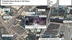 وتقول الجهة المسؤولة عن الموقع إن الصور التقطها قمر اصطناعي تجاري في وقت سابق من الاسبوع الجاري، وانها تظهر "قبورا جماعية حفرت عقب المجزرة التي شهدتها منطقة الحولة مؤخرا."