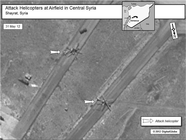 كما تظهر بعض الصور آثار قصف مدفعي قرب التجمعات المدنية في بلدة اتارب في ريف حلب، بينما تظهر اخرى مرابض للمدفعية قرب ثلاث مدن سورية وطائرات مروحية هجومية متمركزة قرب مدينتي الشعيرات وحمص.