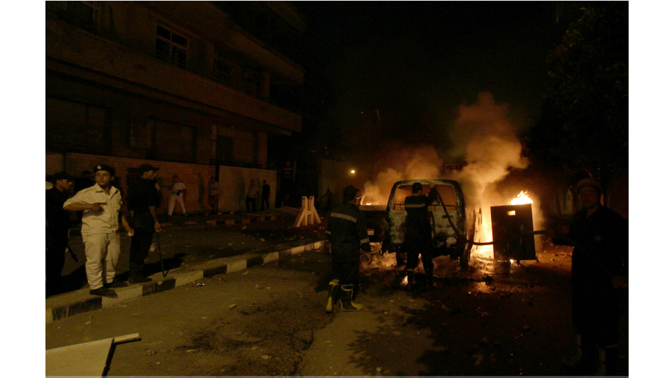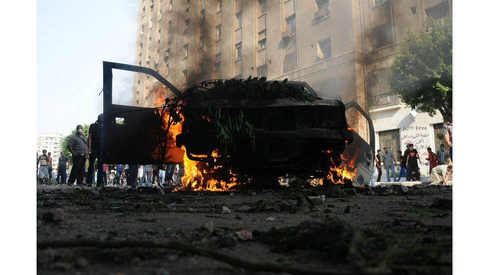 • متظاهرون أضرموا النار في سيارة تابعة للشرطة بالقرب من السفارة.