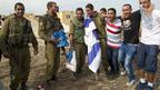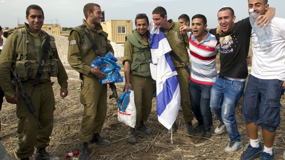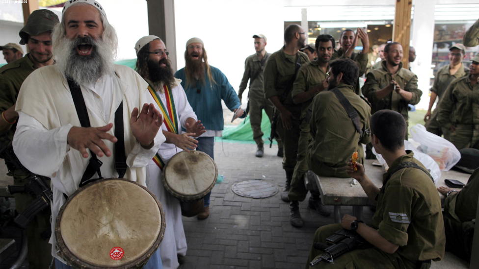 • ياد مردخاي، اسرائيل - يهود متشددون يغنون ويرقصون للترفيه عن الجنود الاسرائيليين المتوجهين الى الحدود مع قطاع غزة.