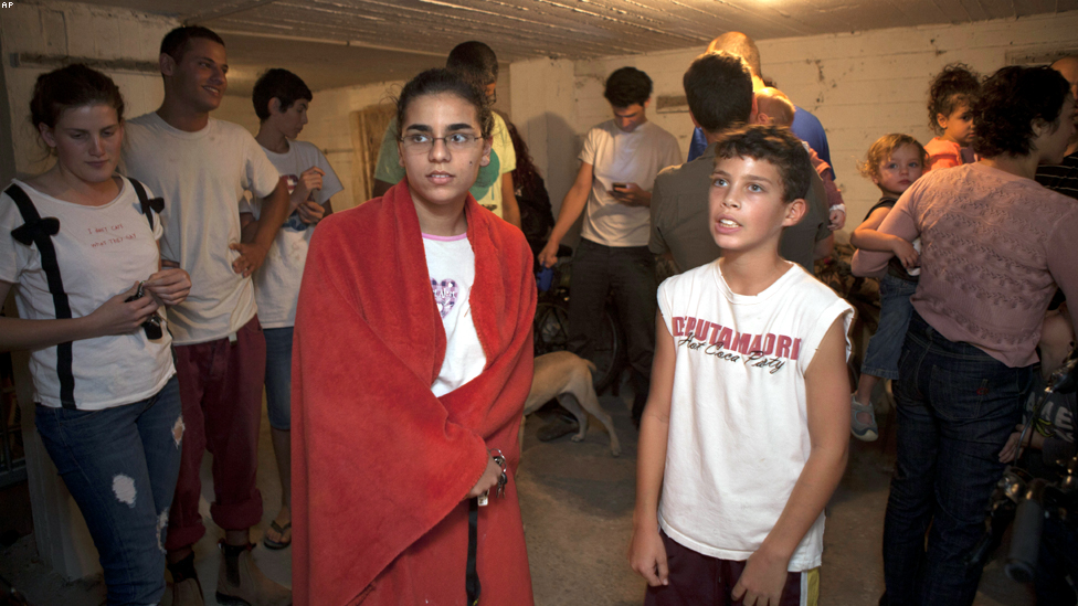 تل أبيب - اسرائيليون يلوذون بالملاجئ مخافة الصواريخ القادمة من غزة.