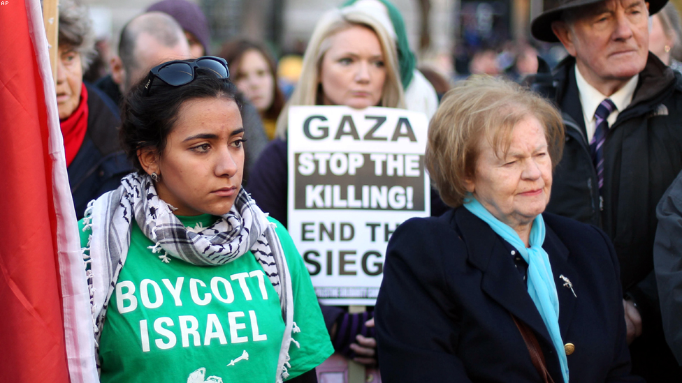 دبلن، ايرلندا - متظاهرون مؤيدون للفلسطينيين في العاصمة الايرلندية.