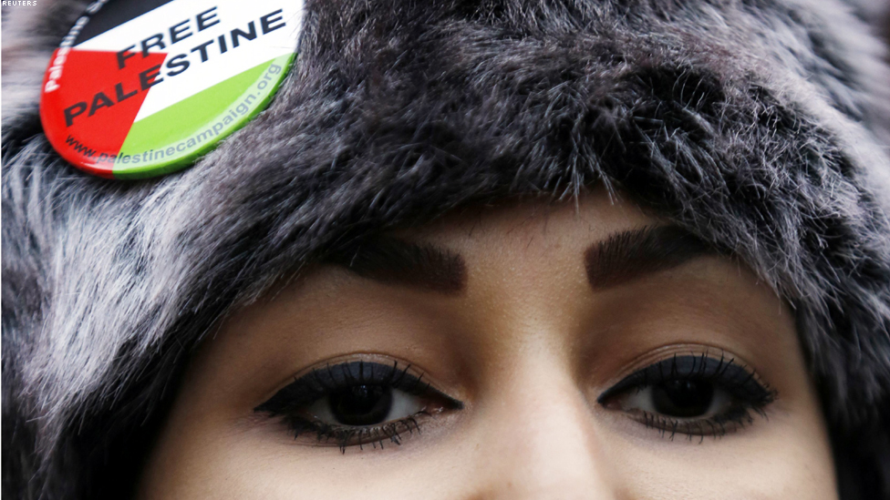 لندن - متظاهرة خارج السفارة الاسرائيلية بالعاصمة البريطانية.