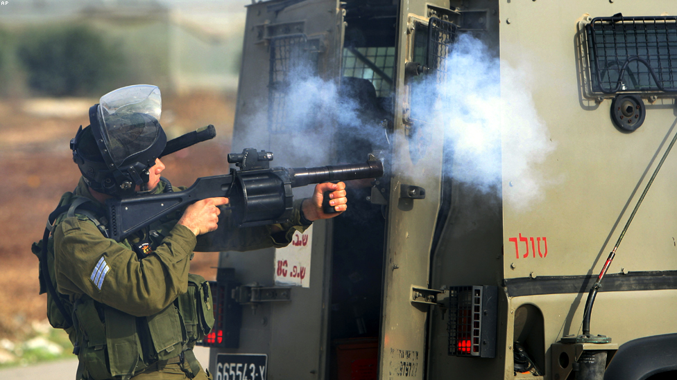 جنين، الضفة الغربية - جندي اسرائيلي يطلق الغاز المسيلب للدموع على متظاهرين فلسطينيين.