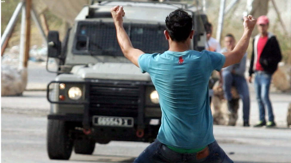 بيتونيا، الضفة الغربية - جنود اسرائيليون يصطدمون بطلبة جامعة بير زيت الذين كانوا يحتجون على قصف غزة.