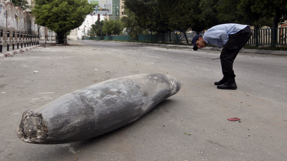 غزة - رجل امن فلسطيني يفحص قذيفة اسرائيلية لم تنفجر.