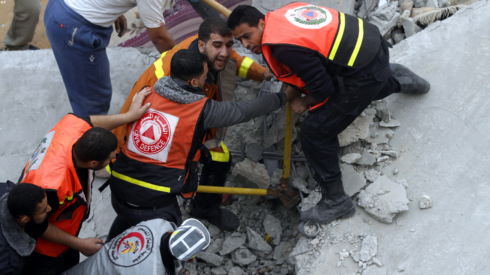 مخيم جباليا، غزة - رجال الانقاذ يبحثون عن ناجين عقب غارة اسرائيلية.