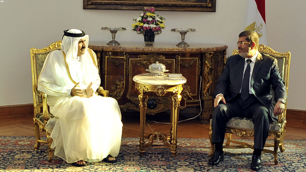 القاهرة - الرئيس المصري يجتمع بأمير قطر. تبرعت قطر بعشرة ملايين دولار لاغاثة قطاع غزة.