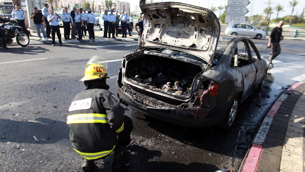 • حولون، قرب تل ابيب - رجل اطفاء اسرائيلي يتفقد سيارة احترقت بفعل صاروخ اطلق من قطاع غزة.