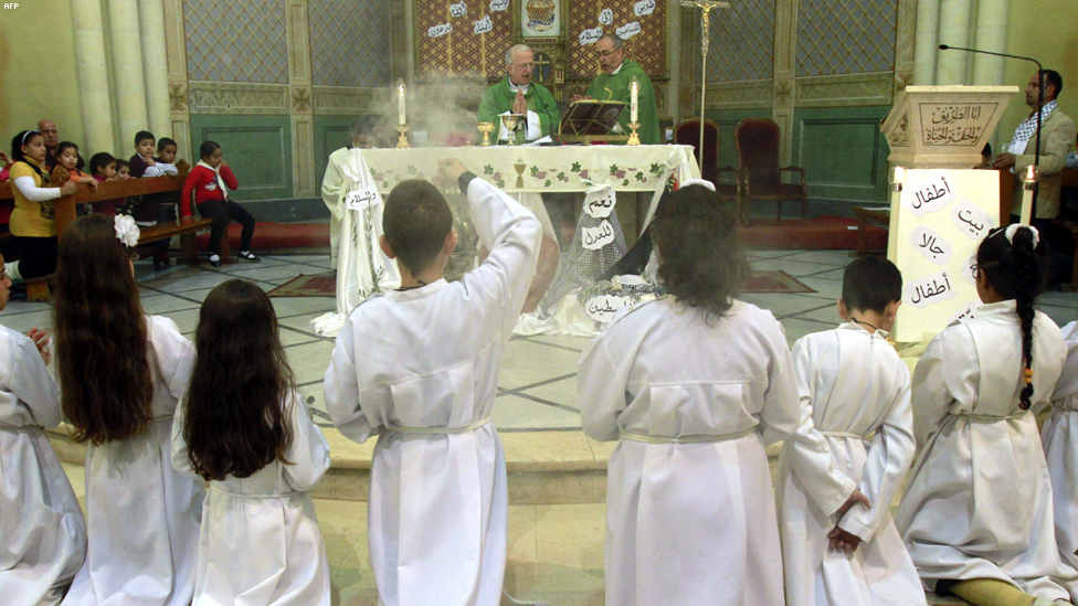 • بيت جالا، الضفة الغربية - الاسقف وليم شومالي يقود قداسا اقيم في كنيسة البشارة لأجل اطفال غزة.