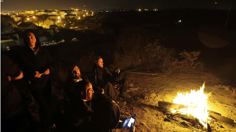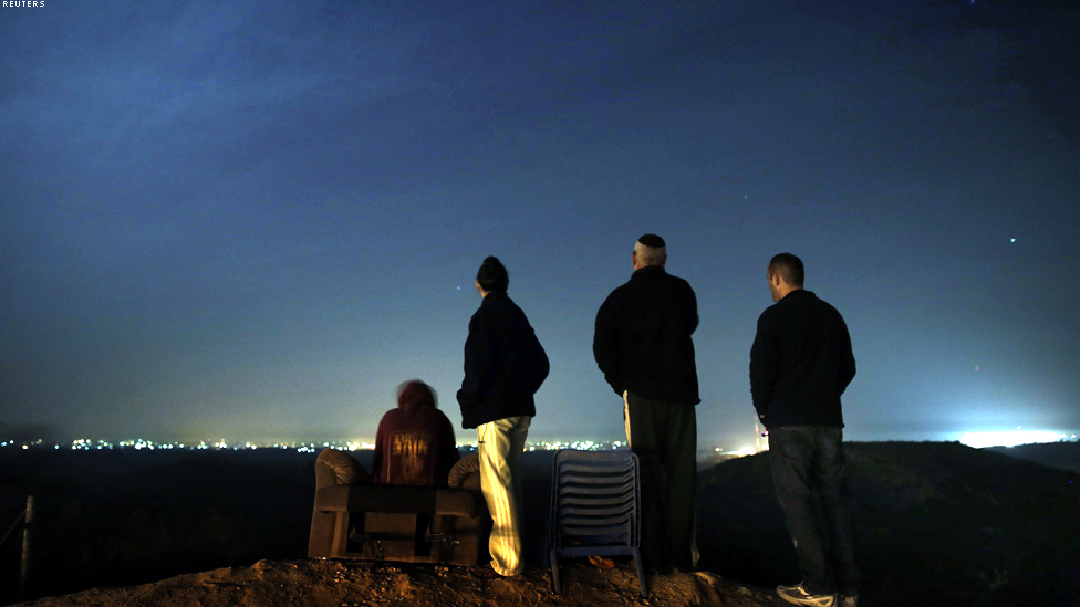 سديروت - اسرائيليون ينظرون الى القتال الدائر على الحدود بين اسرائيل والمسلحين الفلسطينيين قبيل سريان وقف اطلاق النار ليلة الاربعاء.