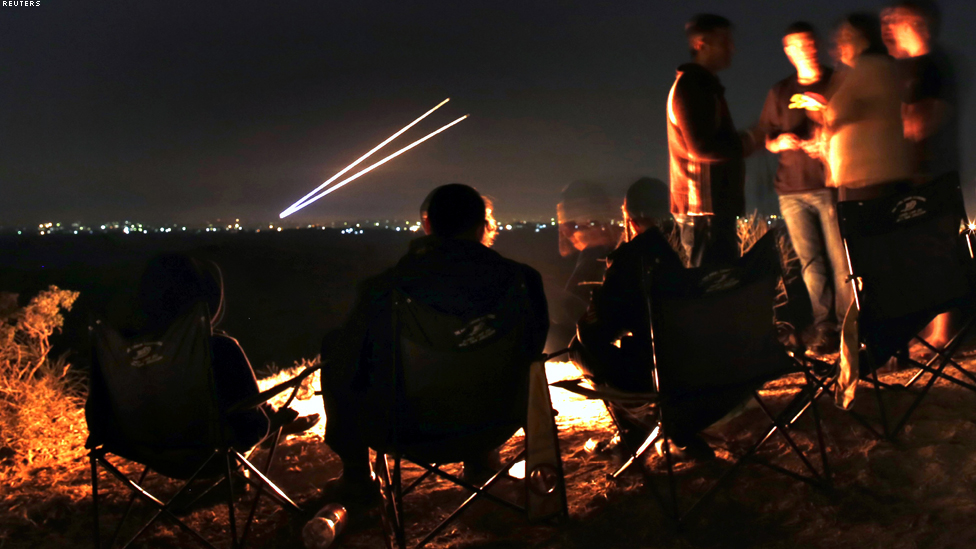 سديروت - اسرائيليون يشاهدون اطلاق صاروخين فلسطينيين من قطاع غزة قبيل سريان مفعول اتفاق وقف اطلاق النار ليلة الاربعاء.
