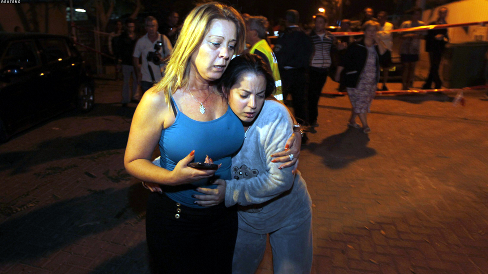 بئر السبع - ام اسرائيلية تحتضن ابنتها عقب سقوط صاروخ فلسطيني في بئر السبع قبيل الاعلان عن سريان اتفاق وقف النار ليلة الاربعاء.