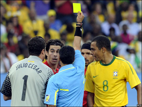 25/6: حكم المباراة يلوح بالبطاقة الصفراء للاعب البرتغالي تياغو في مباراة البرتغال والبرازيل