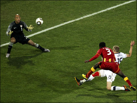 26/6: كيفن برنس بواتينغ يسجل هدف غانا الاول في المرمى الامريكي في الدقيقة الخامسة من المباراة