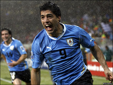 26/6: لاعب اوروغواي لويس سواريز يحتفل بتسجيل هدفه الثاني ضد كوريا الجنوبية في دور الـ 16. خرج المنتخب الكوري الجنوبي من المنافسة