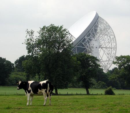 The Jodrell Bank radio telescope is set in a tranquil rural setting. Here you see the contrast between man's cutting-edge space technology and a cow grazing. The radio dish looms slightly ominously behind some trees.
