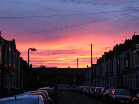 Sunset photos usually seem to be taken in the countryside so I was pleased to get this one in an urban setting - right outside my house in Leicester! I like the reddish light reflecting on the cars and house windows.