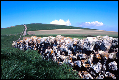 Stone wall looking across St Catherine's Down, Isle of Wight. A 21mm lens set at f16 and fuji Velvia 50 iso was used here.