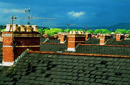 Terraced roof tops after rain Terraced roof tops after a heavy shower in April 2005 ; just as the sun was re-appearing. Location : from a motorway slip-road, Malpas Road, Newport, S.Wales.