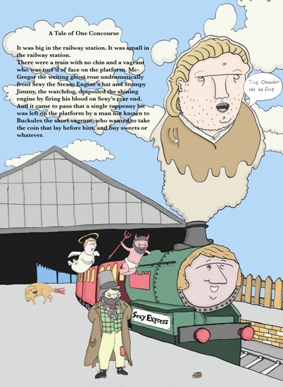There were a train with no chin and a vagrant who was turf'd of face on the platform. McGregor the writing ghost rose undramatically from Sexy the Steam Engine's hat and Stumpy Jimmy, the watchdog, despoiled the shining engine by firing his blood on Sexy's rear end.