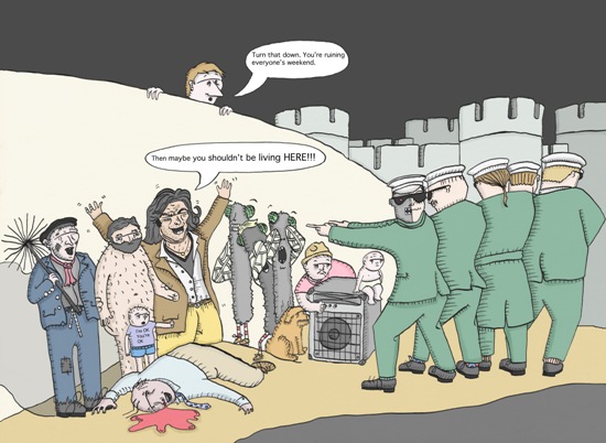 “It is based on The ‘Ghost Town’ video by the Specials. Adam, Joe and chums are fidgeting their way to the Attack the Block premiere in a 1981 Honda Nonsense. Adam (dressed as Fat Sam) is playing with his beard and Joe is joggling his knees and moulding his chin. They are chauffeured by Nikki Listener, who has tucked her ear lobes into her head and Jaguar skills flicks his Adam’s apple. Denny Different ruffles his eyebrows while Mr Roboto provides important information along the way.