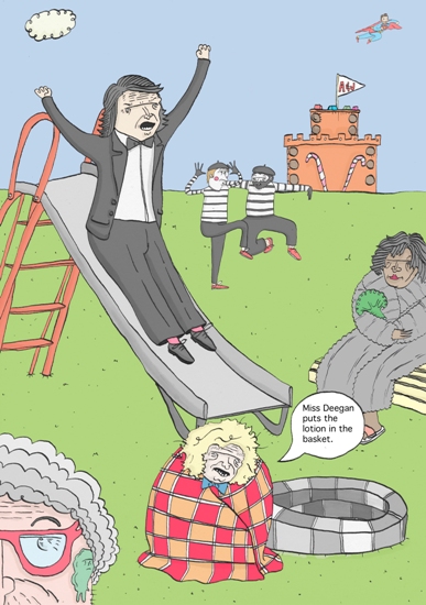 He appears to have a little Loo Reed eating a tasty Lauren Laverne in a lettuce and Del Monte dress. Loo is also surrounded by a number of disgusting British press pigs.