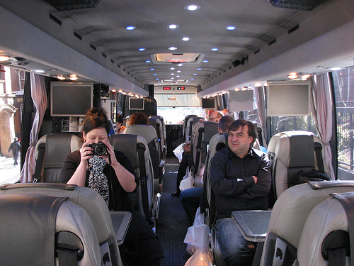 Techbus's first journey happened during Thinking Digital. Backstage had the joy of being on the bus or rather luxury coach. The coach picked me up a little later that expected due to the traffic into Manchester but it was already half full with people from Liverpool. The bus/coach was huge, like something you see superstars or football teams stepping out of rather that geeks with laptops. It turns out that the coach is actually Bolton Wanderers team coach.