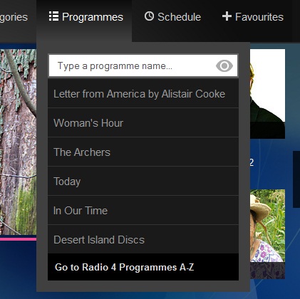 2. To help listeners find programmes we have made the "Programmes A-Z" link more prominent, added in the key programmes to the programmes drop down in the navigation tool bar, added more categories, and made a significant change to the way our programme search works, meaning you no-longer have to type the exact programme title, and search results show programmes even if they are no longer available to listen to (after 7 days for most programmes).