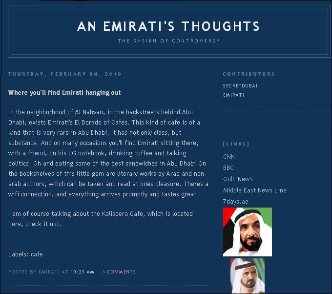An Emirati's Thoughts is simply just that. It's a blog about what a local Emirati thinks of happenings in his country. They vary from one of Abu Dhabi's best hidden gems ,that is a back street Cafe where local Emiratis hang out, to other more topical issues like the Iranian government insisting that the gulf between Iran and its Arab neighbours be called The Persian Gulf.