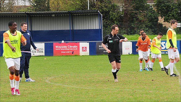 The presentation of cards, pencil and whistle takes place and we're ready to go. Almost. I don't have a coin for the toss - something I didn't even think about. I brief my assistants ("if it all kicks off I expect you to pile in and save me") and the two captains ("I'll respect you so I expect the same back regardless of whether I'm a qualified ref").