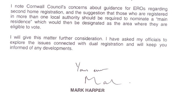 I have set out in detail on the attached briefing note the confusing law and guidance on the registration of voters who own a second (sic) home (sic). This, of course, is a particularly acute problem in Cornwall that affects all electoral areas.