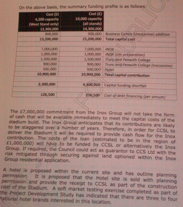 In support of my first point I would quote the suggestion first reported in the West Briton that taxpayers would fund £8m worth of infrastructure to help that project which Inox is really interested in, namely the 1,500-home housing estate. In return, Inox was expected to stump up £7m towards the stadium. A cunning plan to get round the Section 106 rules? Would such a deal be legal? It doesn't feature in the recommendation which was due to have been discussed next week, so I guess it's been quietly dropped.