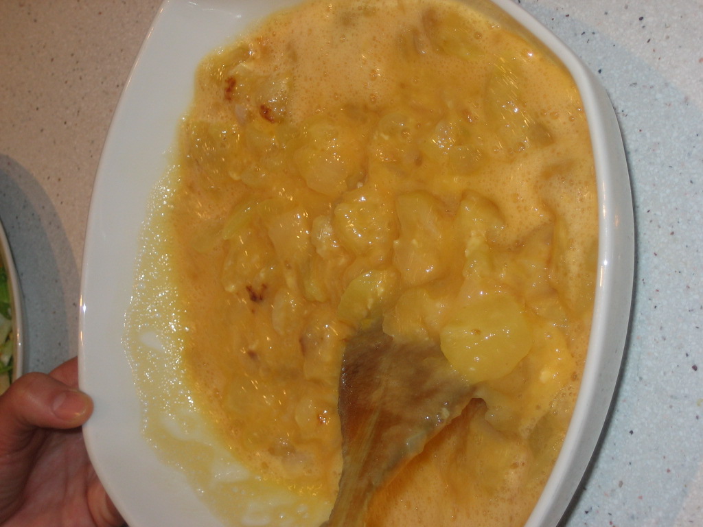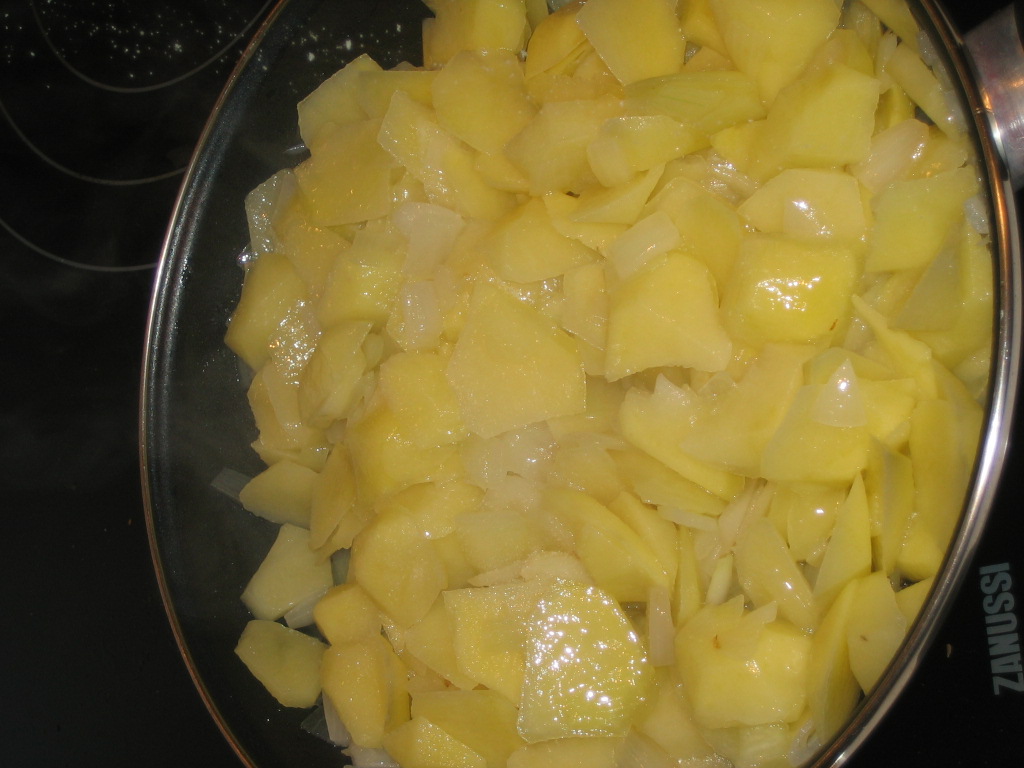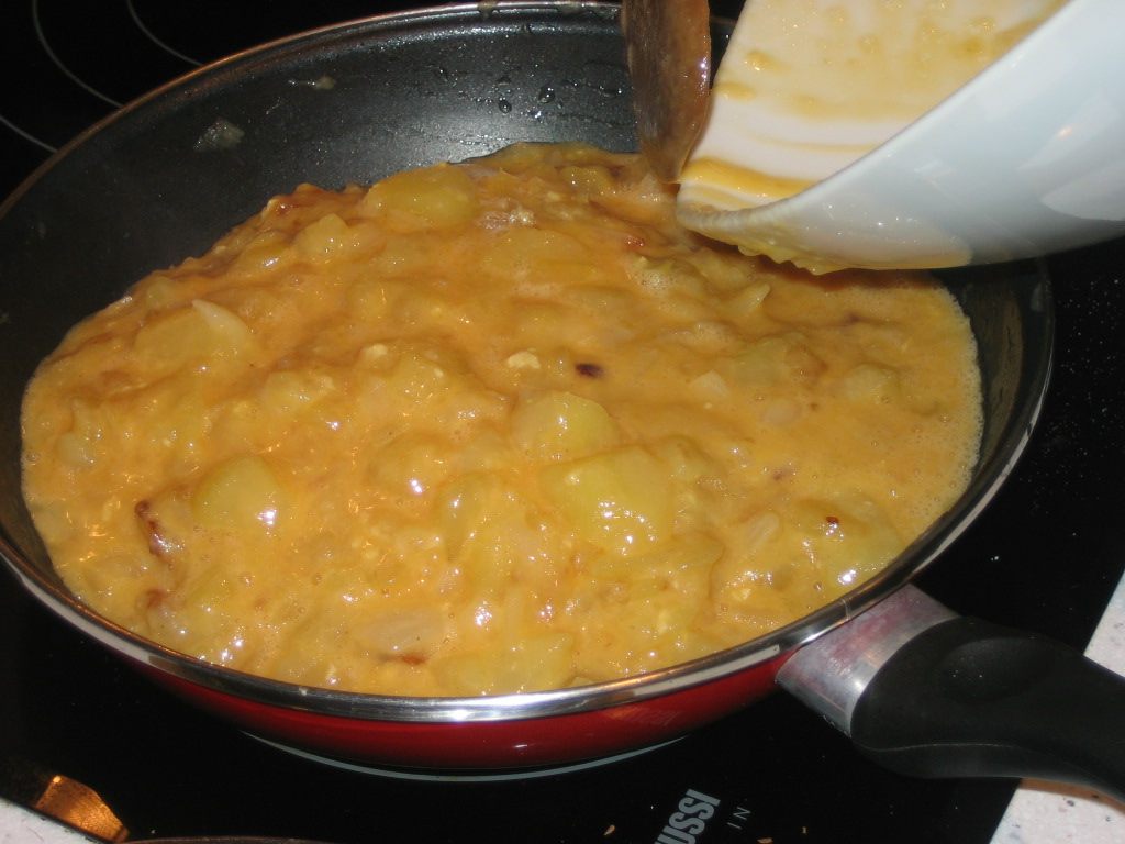 7. Mix the potatoes and onion cooked with the eggs.