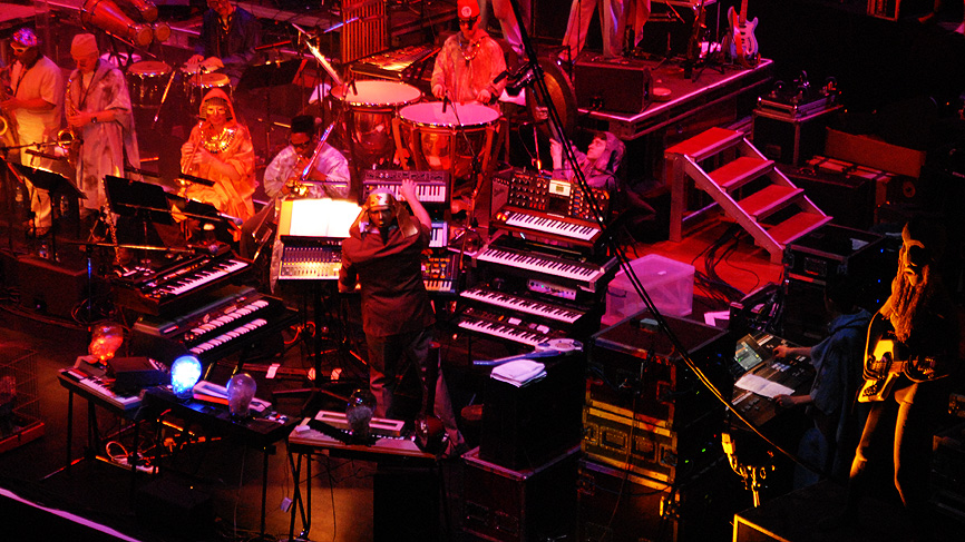 The musical repertoire was super-eclectic, spanning Erik Satie, Sun Ra (of course), Alice Coltrane, Martin Denny, a couple of Specials numbers (a slow spooky rendition of Ghost Town stood out), some old ska tunes...Plenty of free jazz moments allowed the many stellar soloists to take the spotlight, but it was all made nicely chunky-sounding and accessible to a less than hardcore jazz audience thanks to the arrangements and the huge rhythm section and rock-y drumming.