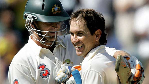 Langer (right) reaches a century for Australia against Pakistan at the Waca in 2004 - photo: Getty