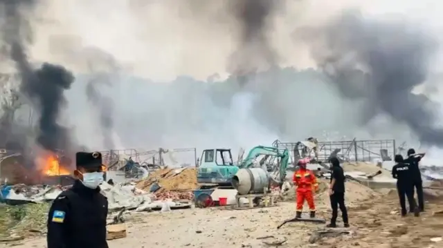 ရုပ်သံဖိုင်တွေထဲ မီးငြှိမ်းသတ်နေတဲ့ မီးသတ်သမားတွေကိုတွေ့ရသလို "ဝ"တပ်ဖွဲ့ရဲ့ တာဝန်ရှိသူတချို့ကလည်း နှာခေါင်းစည်းတွေတပ်ပြီး ပေါက်ကွဲမှုဖြစ်နေတဲ့ နေရာကို ကြီးကြပ်စစ်ဆေးနေတာ တွေ့ရပါတယ်။