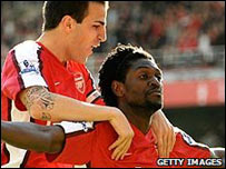 枪手复活 久违的法布雷加斯和阿德巴约本轮双双上场,展现新的灵感,天衣无缝,助阿森纳2:0轻取曼城。 法布雷加斯差不多休战已三个月,阿德巴约的上次出场也是二月初的事情。4月4日的伦敦,春光明媚,两人同样闪光耀眼。 开场仅八分钟,法布雷加斯禁区外右路罚任意球,西班牙人展现细腻独到的脚法,球精确落到阿德巴约的头顶,曼城糟糕的后防居然无人盯防,让多哥球星轻松破门。 法布雷加斯的视野和传球让曼城防不胜防,曼城上半时的最佳机会是替补费尔南德斯的一脚打门,球击中门框弹出。 这对阿森纳是一个提醒。下半时,枪手加强攻势,开场四分钟,法布雷加斯再次与阿德巴约精妙配合,后者再入一球。 法布雷加斯中场带球,将球挑起准确送到阿德巴约的脚下,阿德巴约盘带绕过对方门将吉文,将球送进空门。 对阿森纳来说,此战报了去年11月客场3:0败在曼城脚下的一箭之仇,枪手状态回升,而上次英超联赛输球已是17轮比赛前的事了。