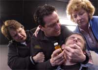 Pitsio'n berffaith Glyn Pritchard oedd yn chwarae'r anffodusyn, Derec, gan smocio, neu o leia danio sigarets yn ddiddiwedd.