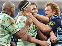 Cyfartal 9-9 oedd y sgôr ar yr hanner yn dilyn tari gôl gosb yr un i Dan Parks a Stephen Myler, ond roedd hynny'n cuddio'r ffaith mai'r Gleision oedd wedi ymosod bron yn ddi-baid gyda'r bêl yn eu dwylo. Gwastraffwyd sawl agoriad i groesi am gais, ond fe ddaeth y sgôr haeddiannol o'r diwedd wedi pedwar munud o'r ail hanner pan diriodd Richard Mustoe wedi bylchiad arbennig Casey Laulala. Trosodd Blair i agor saith pwynt o fantais, ond profodd y 10 munud nesaf i fod yn gostus iawn i'r tîm cartref wrth golli Bradley Davies i'r gell gosb cyn i brynhawn Xavier Rush ddod i ben wrth weld cerdyn coch am dacl uchel. Manteisiodd yr ymwelwyr ar y ddau drosedd yna wrth i Myler ychwanegu chwe phwynt arall gyda'i droed. Aeth y Saints ar y blaen wedi awr o chwarae gyda chweched gôl gosb, ond ymatebodd y Gleision yn syth wrth i Parks lwyddo gyda gôl adlam o flaen y pyst. Northampton oedd bellach y tîm mwyaf peryglus gyda'r bêl yn eu dwylo, gyda cefnwr Ben Foden yn bylchu ar sawl achlysur. A rhediad nerthol arall gan Foden arweiniodd at y gais dyngedfennol i Calum Clarke, ond roedd mwy nag ychydig o amheuaeth ynglŷn a'r sgôr. Cafodd yr eilydd ei ddal modfeddi'n brin o'r llinell cyn iddo geisio ymestyn eto am y llinell. Roedd hi'n ymddangos bod llaw un o'r Gleision o dan y bêl, ond penderfynodd y dyfarnwr fideo fod y cais yn ddilys. Daeth llygedyn o obaith i'r Gleision wrth i Clarke dderbyn gerdyn melyn gyda tri munud i fynd, ond roedd hi ar ben i dîm Dai Young pan lithrodd y bêl o afael Maama Molitika mewn safle ymosodol addawol.